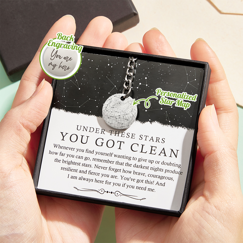 Die personalisierte Sternenkarte bietet einen Blick in den Himmel. Sie hält fest, wie die Sterne in der Nacht an dem Ort und Datum Ihrer Wahl genau aussahen. Das ist eine einzigartige Möglichkeit, sich an den besonderen Tag zu erinnern, an dem sie clean wurden. Stellen Sie sich ihr Gesicht vor, wenn sie dieses Geschenk öffnen, den personalisierten Schlüsselanhänger sehen und die herzliche Botschaft lesen ... sie werden dahinschmelzen!