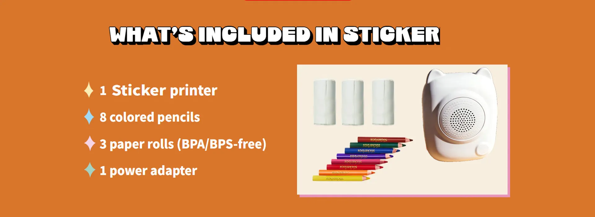 Lieferumfang: 1 Set (1 Drucker, 8 Buntstifte, 3 Papierrollen (180 Aufkleber, BPA/BPS-frei), 1 Netzteil)Größe & Gewicht: Kompaktes Würfeldesign: 9,5 cm (3,75 Zoll)