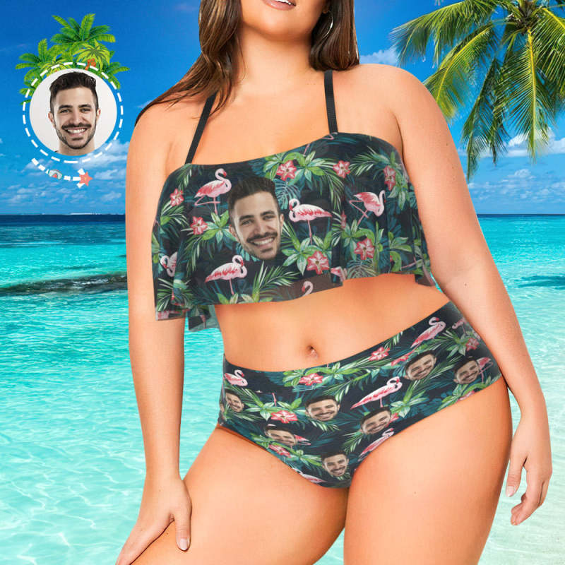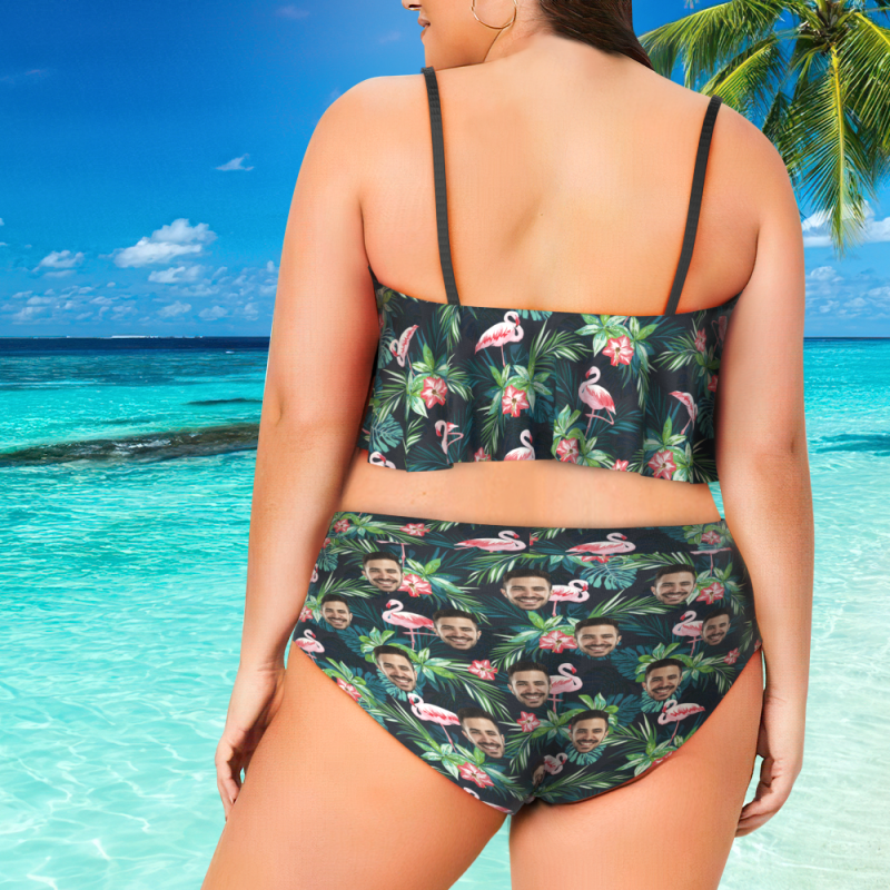 Bester Plus-size-badeanzug, Gesichts-badeanzug, Individueller Rüschen-bikini Mit Hoher Taille Im Gesicht – Blätter Und Flamingo