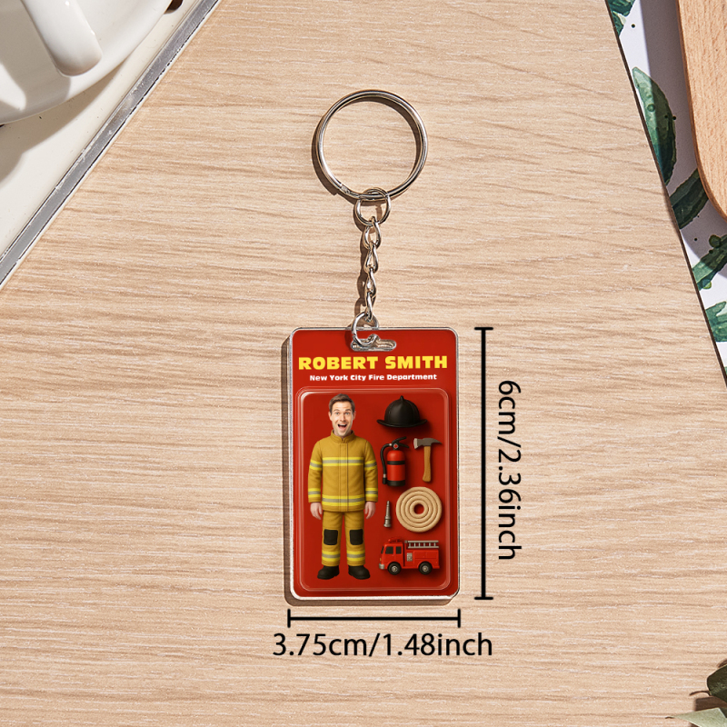 Anpassbarer Kopf Benutzerdefinierte 3d-effekt Actionfigur Pack Verpackung Spielzeugbox Stil Kunst Geschenk Personalisierte 2D-Druck Acryl Schlüsselanhänger Geschenk Für Feuerwehrmann