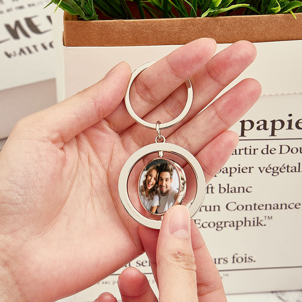 Überraschen Sie Ihre Liebsten mit einem personalisierten Foto-Schlüsselanhänger! Dieser individuelle, drehbare, doppelseitige Schlüsselanhänger zeigt Ihre eigenen Fotos und ist ein wunderschönes und einzigartiges Geschenk, an dem Sie ein Leben lang Freude haben werden. Perfekt für jeden Anlass. Zeigen Sie Ihre Wertschätzung mit einem personalisierten Andenken.