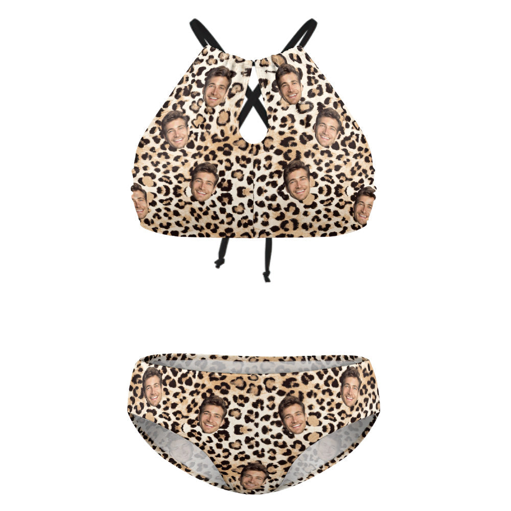 Custom Face Plus Size Bademode, Personalisierter Bikini-badeanzug Mit Leopardenmuster Und Hoher Taille