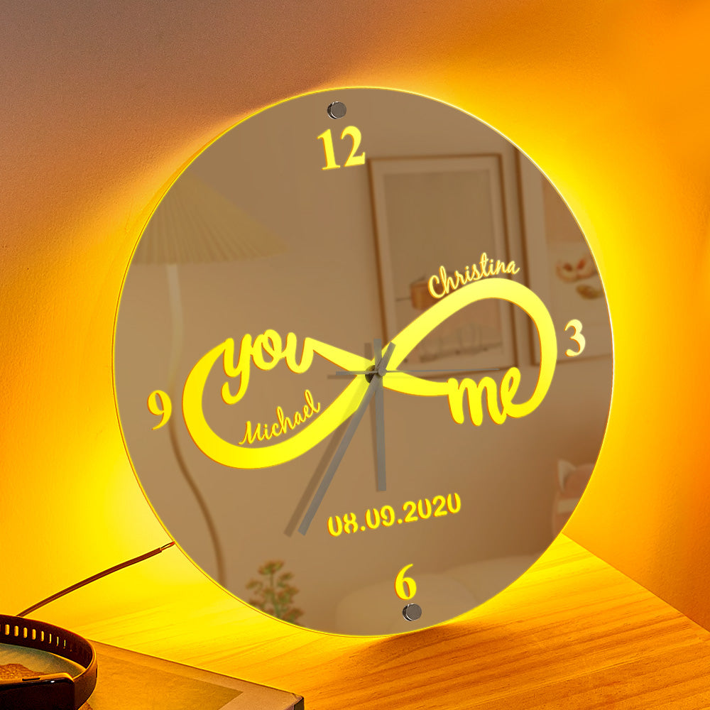 Personalisierte Infinity-namensuhr “You & Me”, Personalisierte Datumsspiegel-licht-wanddekoration