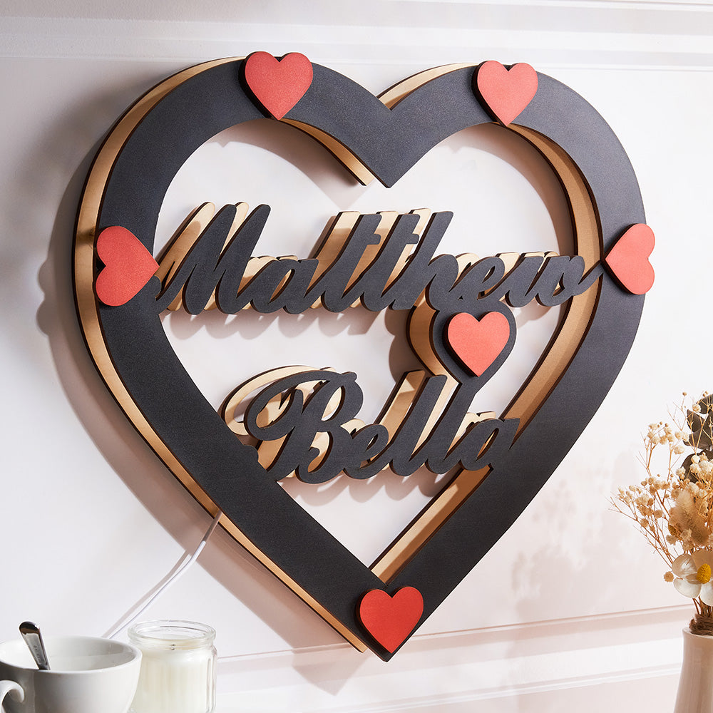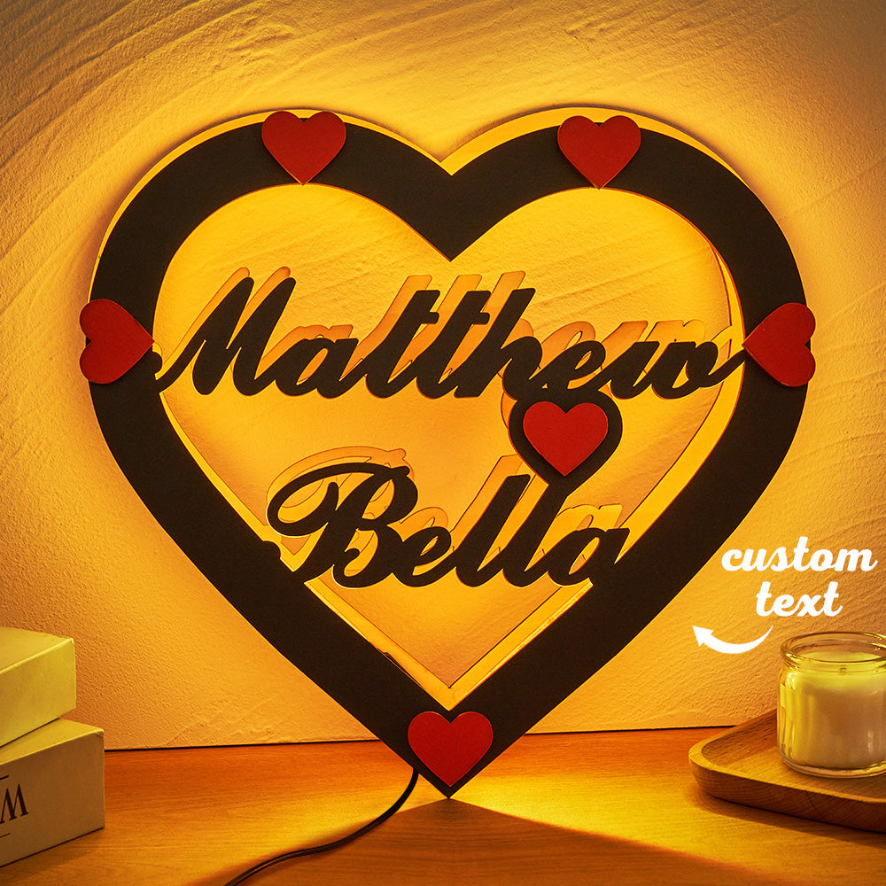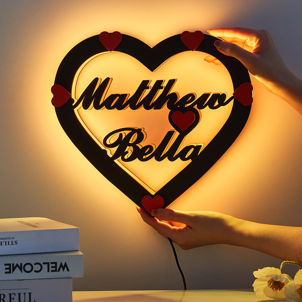 Dieses Nachtlicht schafft einen warmen und persönlichen Raum für Du. Verzaubern Sie Ihr Liebesleben mit diesem wunderschönen Wandbehang mit individuellem Namenspaar und LED-Licht. Bringen Sie einzigartige Erinnerungen in Ihre besonderen Momente.