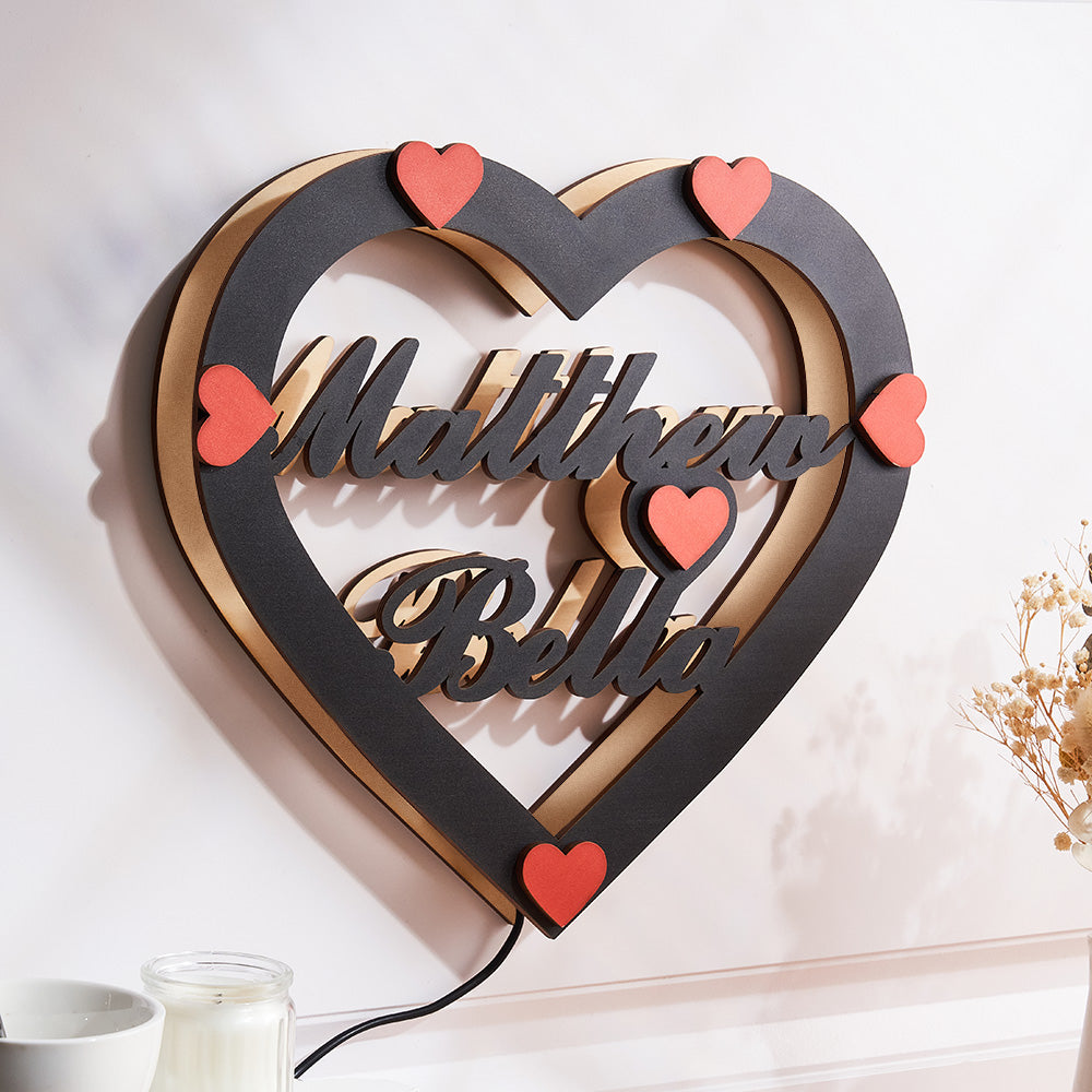 Herzförmiges Nachtlicht aus Holz, warme Holzfarbe, mit roter Liebesdekoration. Einer davon ist Ihr Name oder ein Name, den Sie ausdrücken möchten. Der andere kann der Name Ihres geliebten Menschen, Familienmitglieds oder Freundes sein. Dieses individuelle Nachtlicht ist nicht nur eine Dekoration, sondern auch ein einzigartiges Geschenk, das sich zum Feiern von Geburtstagen, Jubiläen oder als romantisches Geschenk zum Ausdruck Ihrer tiefen Zuneigung eignet.