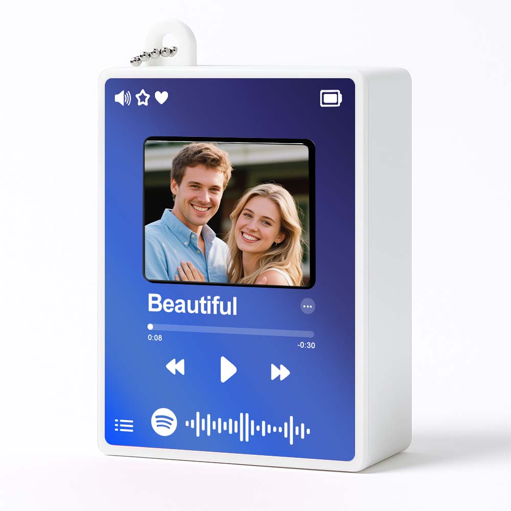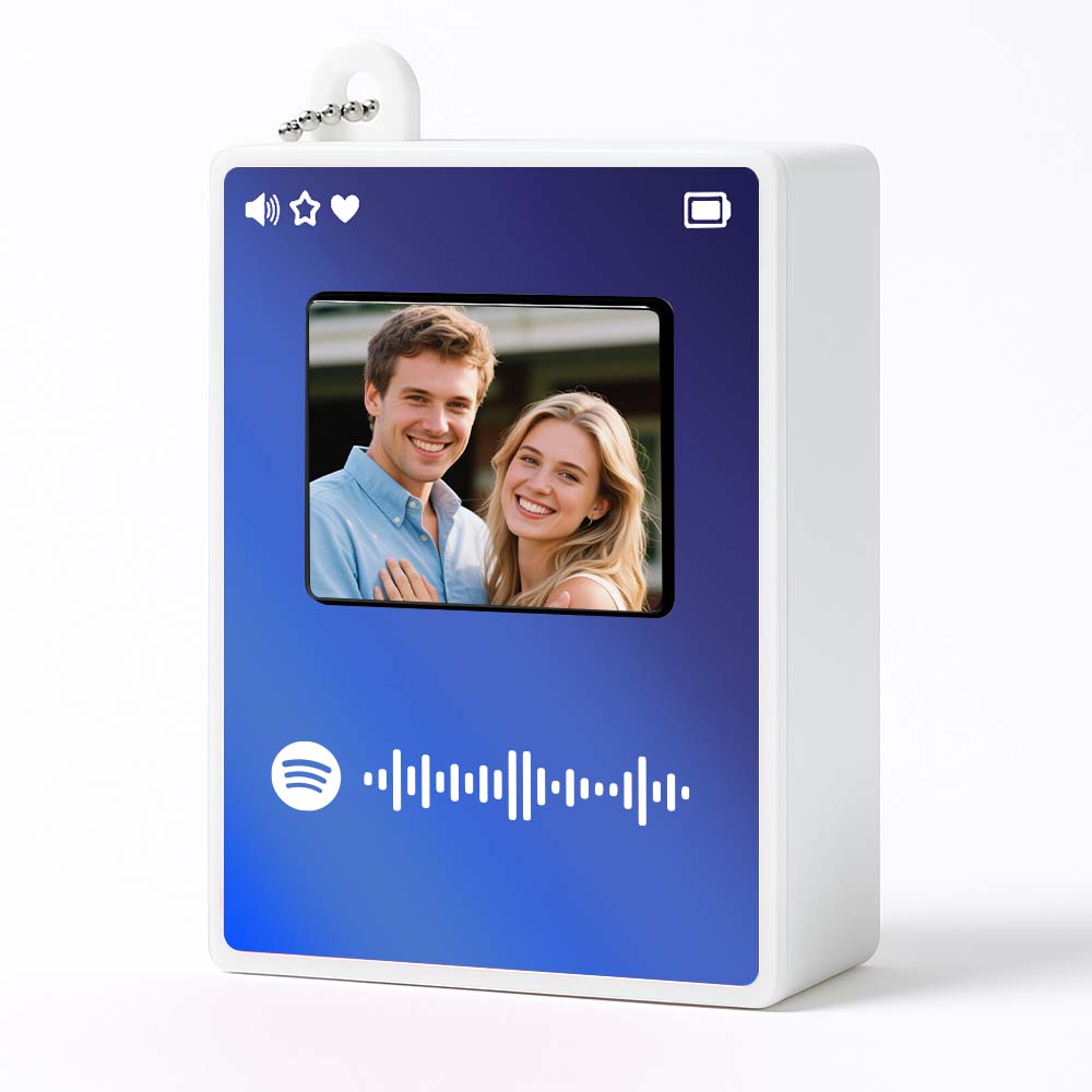 Tragen Sie Ihre schönsten Erinnerungen und Melodien überallhin mit! Dieser personalisierte Schlüsselanhänger kombiniert ein individuelles Foto mit einem Mini-Musikplayer, mit dem Sie Ihren Lieblingssong speichern und jederzeit abspielen können. Laden Sie einfach Ihr Foto hoch und wählen Sie den Titel, der Ihnen am meisten bedeutet – ob Liebeslied, Familienlied oder der Soundtrack eines besonderen Moments.