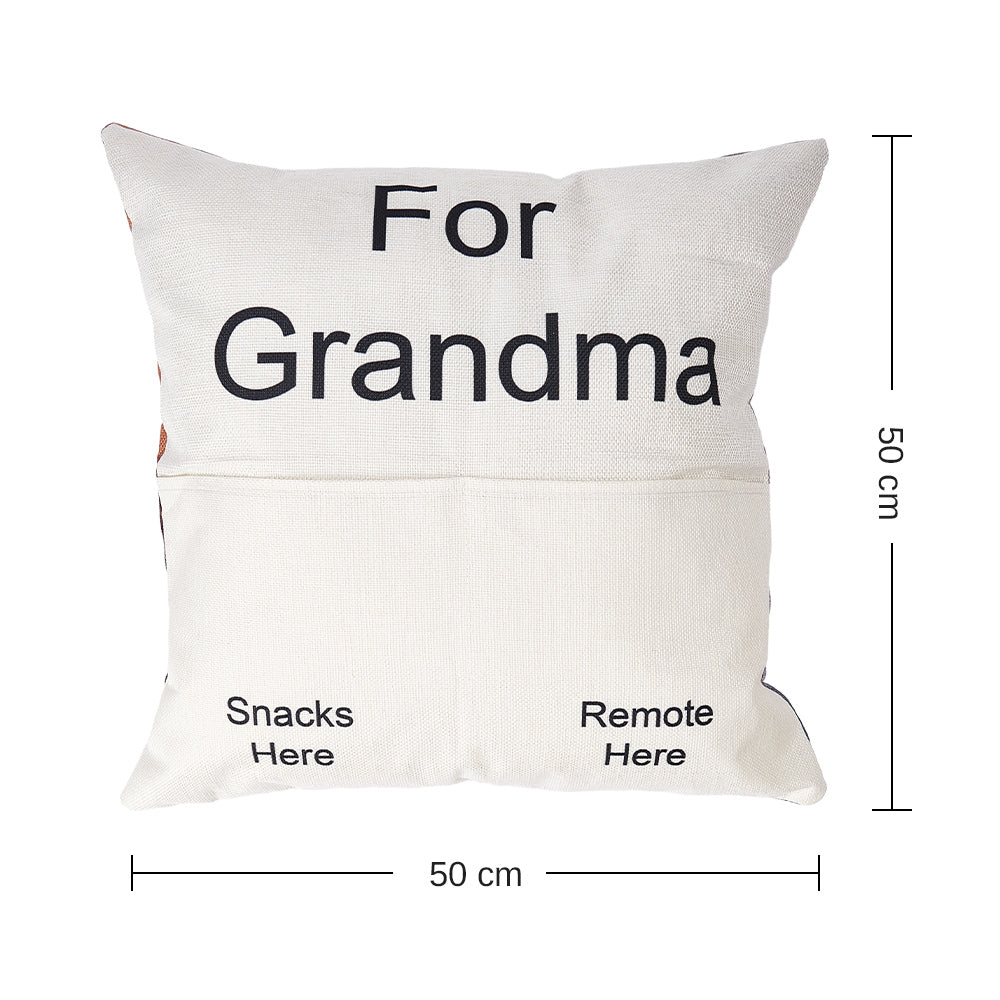 Die Tasche kann individuell bedruckt werden SNACKS HERE, REMOTE HERE, GLASSES HERE, etc. Du kannst ein Foto hochladen und wir drucken es auf die Rückseite des Kissenbezugs.