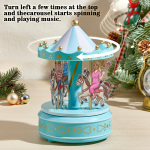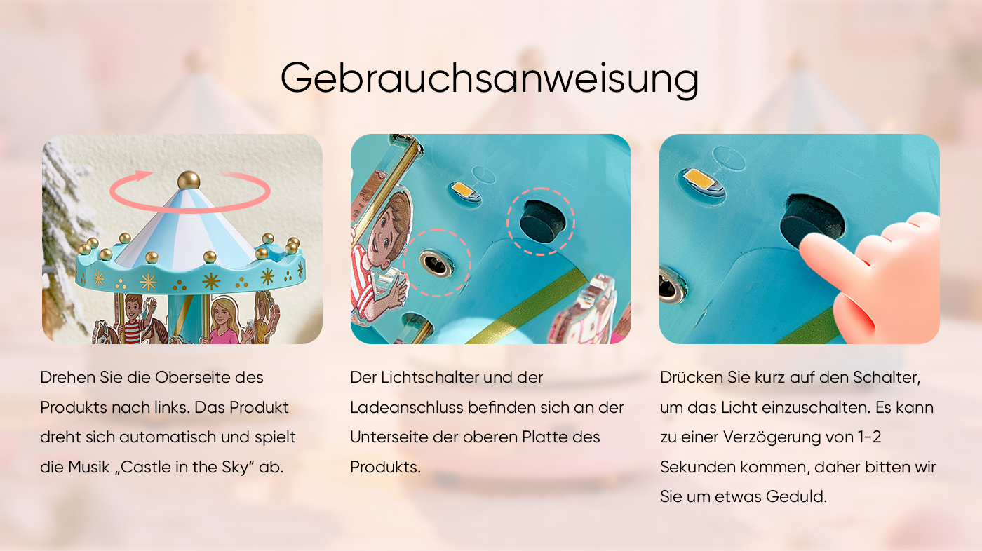 - Drehen Sie die Drehen Sie das Karussell oben nach links und unten nach rechts. Es dreht sich automatisch und spielt das Lied „Castle in the Sky“.