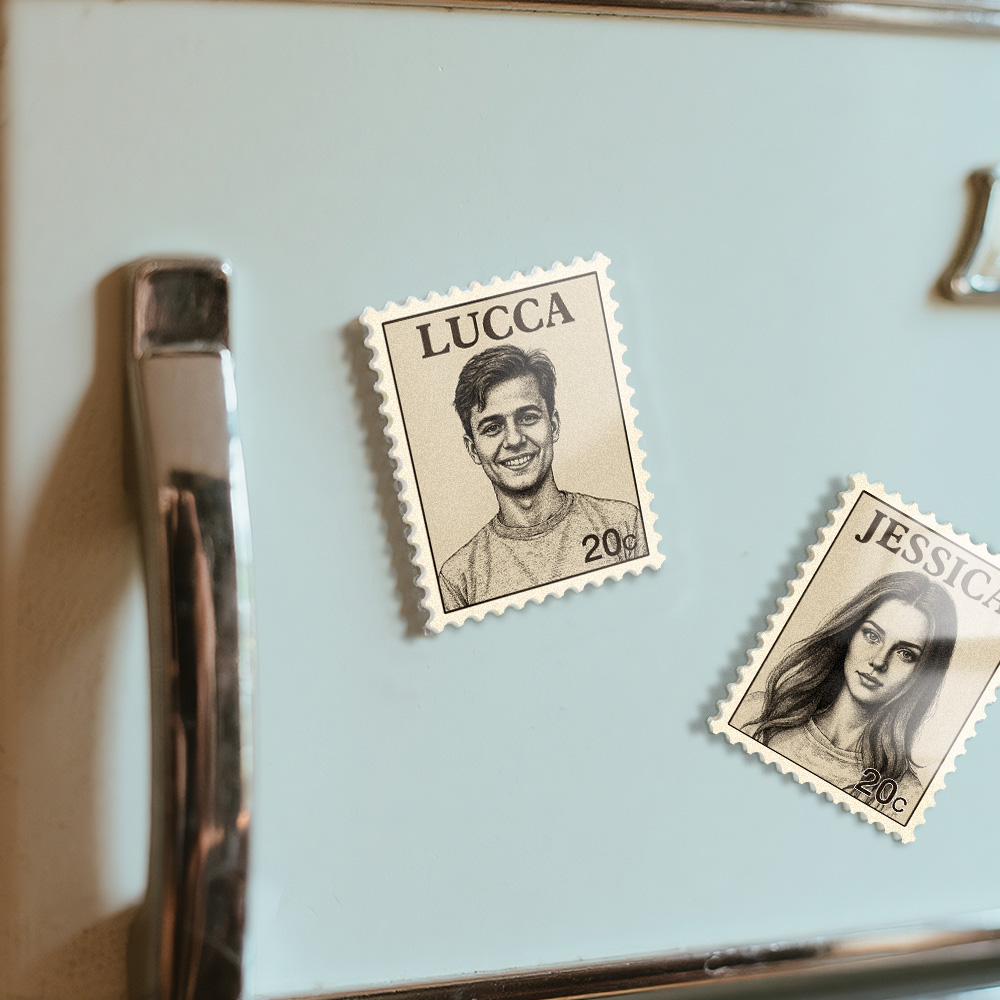 Verleihen Sie Ihrer Küche mit unseren individuellen Kühlschrankmagneten mit Porträtstempel eine persönliche Note! Diese einzigartigen Magnete im Vintage-Stil zeigen ein wunderschön illustriertes Porträt auf einem stempelförmigen Design, komplett mit Ihrem Namen oder dem eines geliebten Menschen. Die filigrane Linienführung harmoniert mit einem sanften, beigen Hintergrund und den perforierten Kanten für ein authentisches, nostalgisches Gefühl.