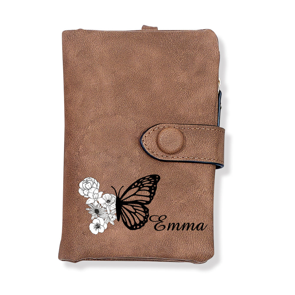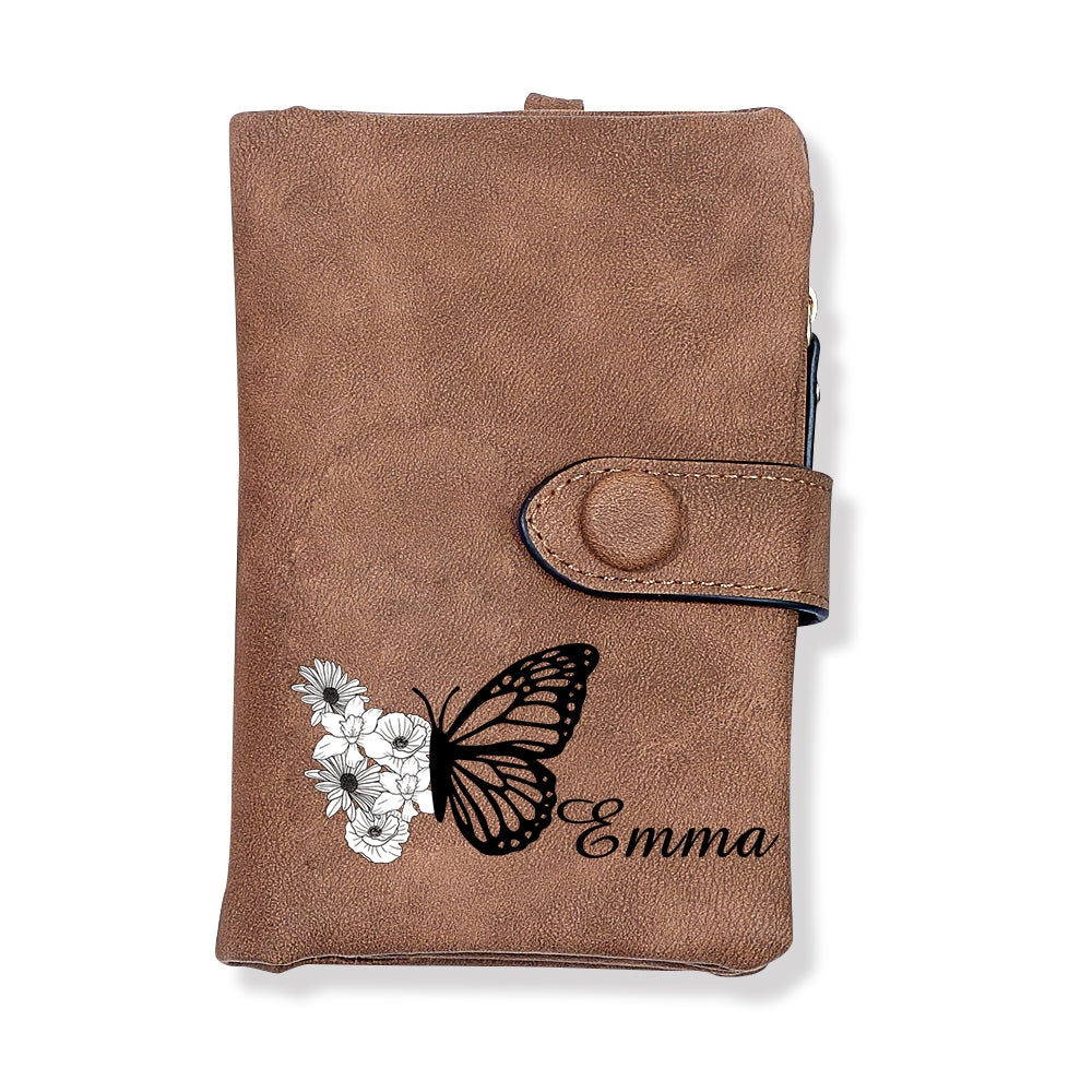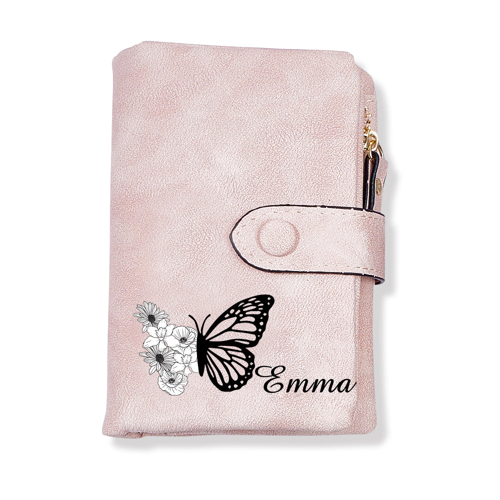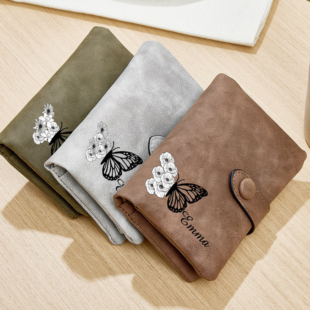 Benutzerdefinierte Dreifach Gefaltete Leder-geldbörse Mit Schmetterlings-geburtsblume Und Münzhalter, Personalisiertes Muttertagsgeschenk Für Frauen