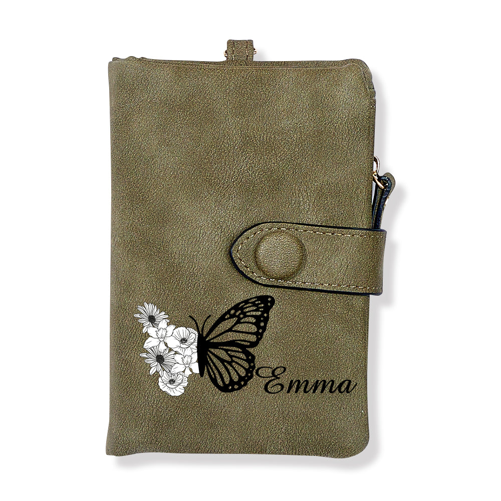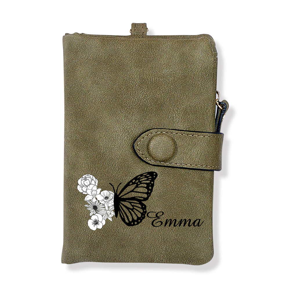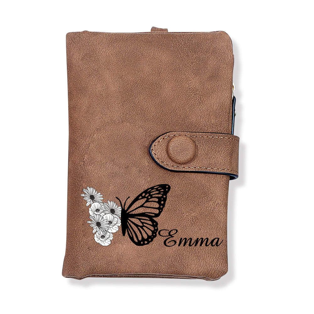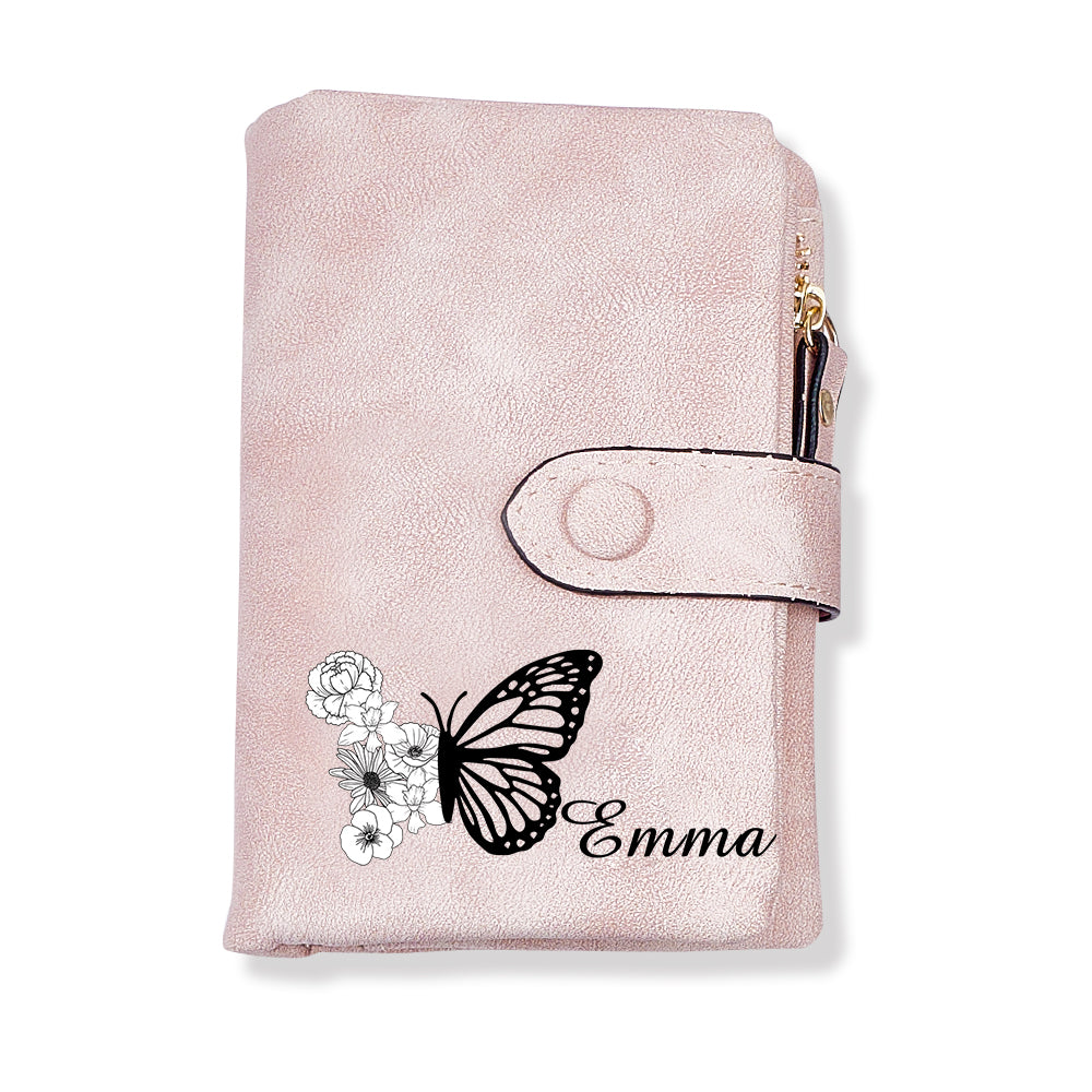 Benutzerdefinierte Dreifach Gefaltete Leder-geldbörse Mit Schmetterlings-geburtsblume Und Münzhalter, Personalisiertes Muttertagsgeschenk Für Frauen