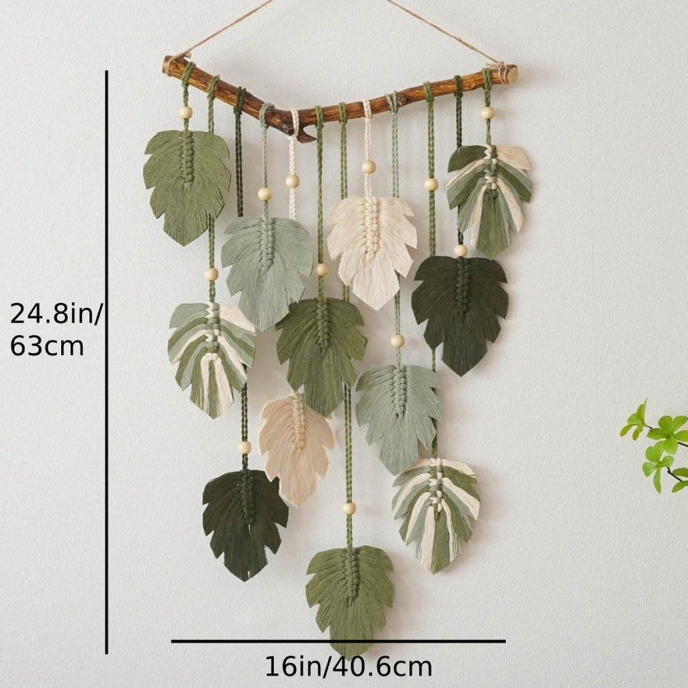 Unser Wanddekor mit grünen Blättern ist eine einzigartige und stilvolle Ergänzung für jedes Zuhause. Dieser wunderschöne Makramee-Wandbehang verfügt über ein atemberaubendes grünes Blattdesign und ist damit die perfekte Wahl für Pflanzenliebhaber und Naturliebhaber. Mit seiner vielseitigen Mischung aus skandinavischen, modernen Mid-Century- und Boho-Stilen fügt es sich nahtlos in Ihre ästhetische Raumdekoration ein.