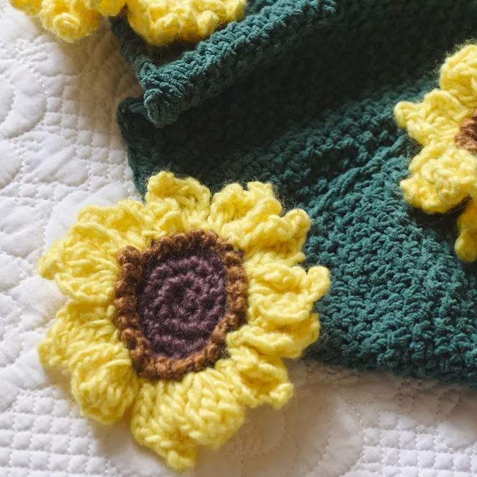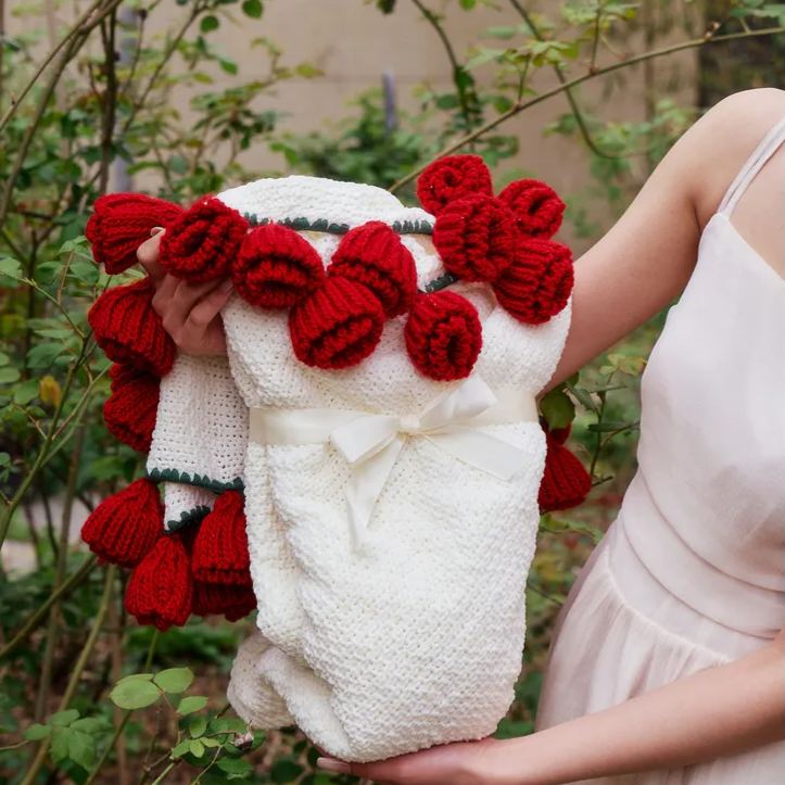 Handgestrickte Decke Mit Roten Rosen Und Sonnenblumen – Fertiges Geschenk Zum Muttertag