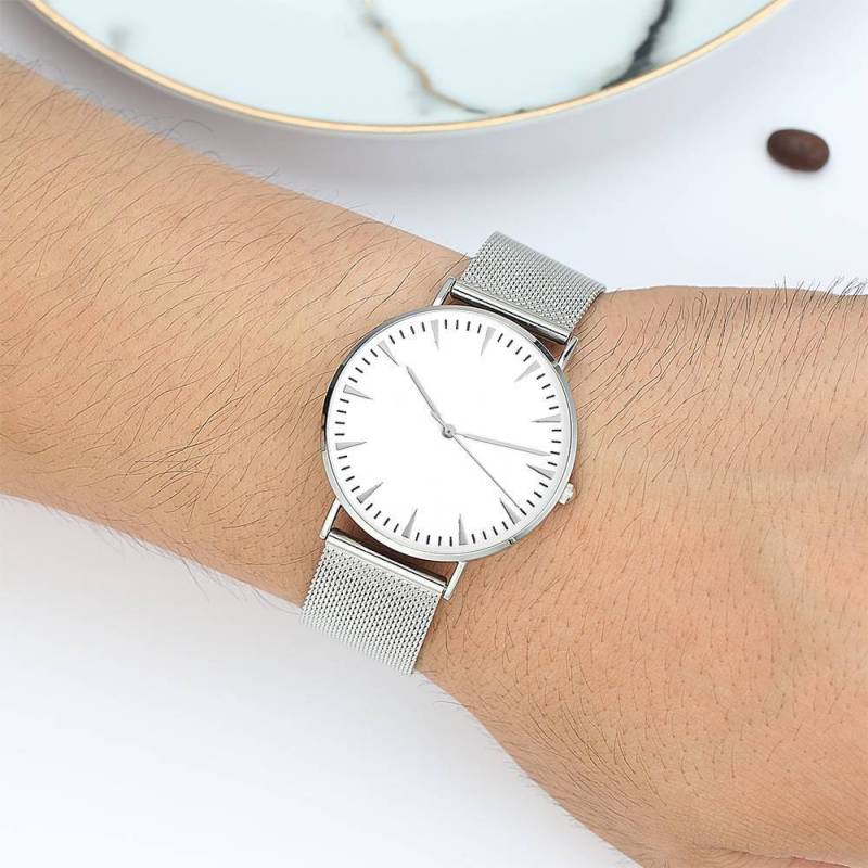 GIFTlab nimmt die Uhrwerke an, die vom weltweit führenden Uhrwerkhersteller Ronda in der Schweiz und Citizen in Japan hergestellt werden, Sie werden die genaue Zeit genießen, die Sie wünschen. Alltagstauglich wasserabweisend. Sie ist ein echtes Designer-Statement und die perfekte Uhr für jeden Anlass. Diese Uhr hat ein einfaches und einzigartiges Design, mit einem schlanken Gehäuse, mit dem Sie problemlos jede Art von Zubehör kombinieren können. Diese klassische Uhr ist ein perfektes Geschenk für Sie oder Ihre Freunde auf elegante und luxuriöse Weise. GIFTlab hat eine Menge individueller Schmuckoptionen zu vernünftigen Preisen und tolle Geschenke für alle möglichen Anlässe wie Geburtstage, Feiertage, Jubiläen. Es ist großartig zum Schichten, ein wunderbares minimalistisches Stück, perfektes Geschenk für Ihre Frau, Freundin, Ehemann, Freund oder einfach um sich selbst etwas zu gönnen! Mesh-Armbanduhr mit silberfarbenem Armband und weißem Zifferblatt – Herren.