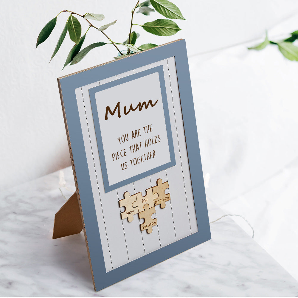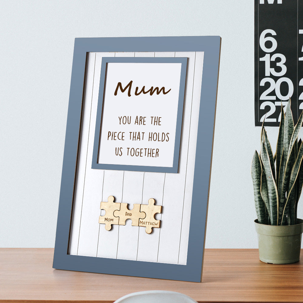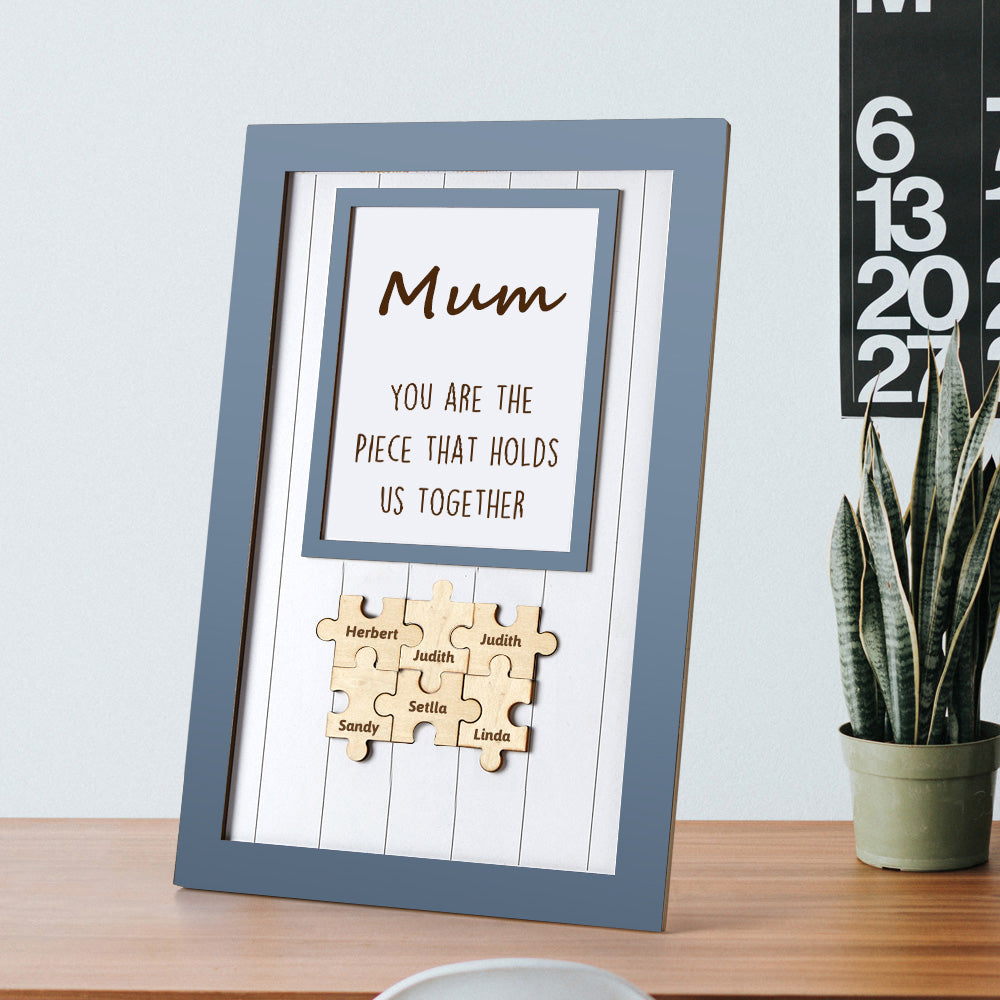 Personalisierte Rahmen für die Heimdekoration können mit dem Bild Ihrer Familie und dem Namen eines Familienmitglieds (bis zu 6 Namen) individuell gestaltet werden. Und stolz verkünden "Du bist das Stück, das uns zusammenhält" zu Mama.