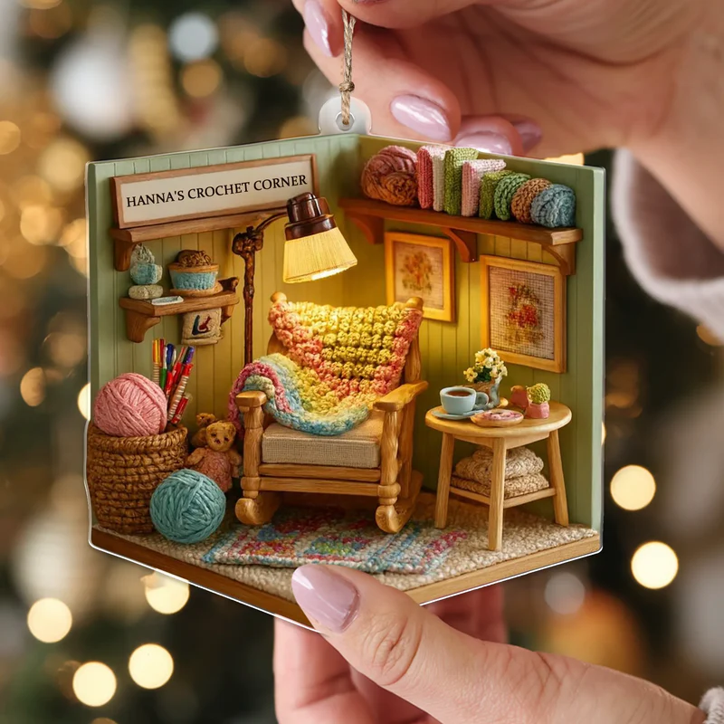 Feiern Sie die Schönheit handgemachter Kunstwerke mit diesem personalisierten Häkelecken-Ornament aus Acryl, einer liebevollen Dekoration speziell für Häkel- und Garnliebhaber. Das flache 2D-Design mit realistischem 3D-Effekt erweckt eine gemütliche Ecke mit buntem Garn, einer handgemachten Decke und einem gemütlichen Sessel zum Leben, der Wärme und Komfort ausstrahlt.