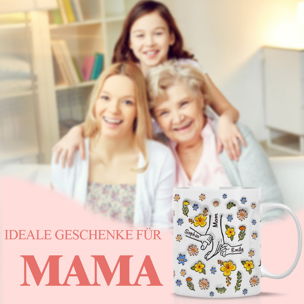 Zeigen Sie Ihre Liebe und Wertschätzung für Mama oder Oma mit einem einzigartigen Design, das sowohl die Hände als auch das Herz wärmt. Diese Tasse zeigt eine berührende Illustration von Händchenhalten, eine herzliche Hommage an die geschätzte Bindung zwischen Familienmitgliedern.