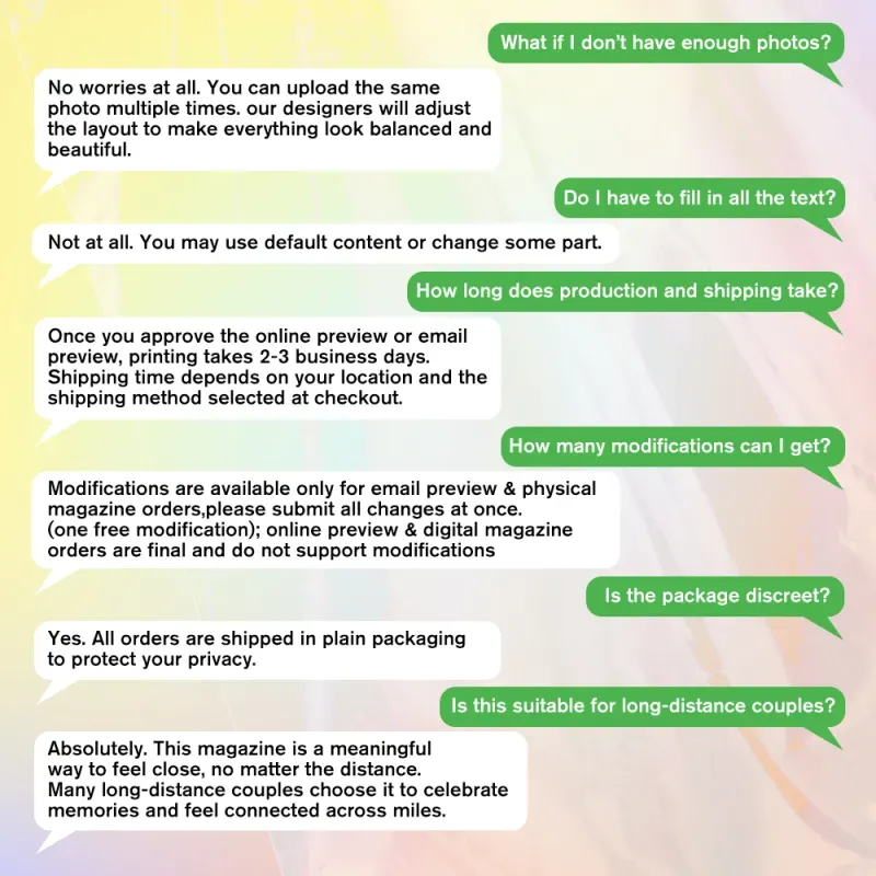 Geben Sie Ihre Liebe in Personalisiertes Pärchenmagazin ein – ein einzigartiges Erinnerungsstück, das Ihre Liebesgeschichte auf die kreativste Weise feiert. Jede Seite wird mit Ihren Fotos, Namen, wichtigen Daten und schönen Momenten gestaltet und in ein stilvolles Magazin-Layout verwandelt, das gleichermaßen Freude bereitet und berührt.
