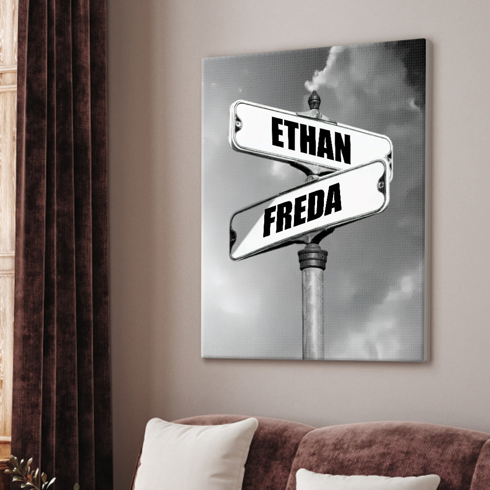 Personalisierter Leinwanddruck mit Namen und Vintage-Straßenschild, sehr gut geeignet für Schlafzimmer, Wohnzimmer oder Küche, aber auch in anderen Innenräumen wie Büro, Restaurant, Wartezimmer. Es eignet sich hervorragend als ideales Valentinstag-, Weihnachts- und Neujahrsgeschenk für Ihre Verwandten und Freunde. Stellen Sie sich den Gesichtsausdruck Ihres Freundes vor, wenn er die Schachtel öffnet und darin diese tolle Leinwand mit einem einzigartigen Design findet.