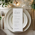 Werten Sie Ihren Hochzeitsempfang mit unserem personalisierten, minimalistischen Hochzeitsmenü auf. Geben Sie Ihren Gästen das Gefühl, etwas Besonderes zu sein, mit einem maßgeschneiderten Menü in schlichtem und elegantem Design. Verleihen Sie Ihrem besonderen Tag eine persönliche Note mit unseren hochwertigen Menükarten.