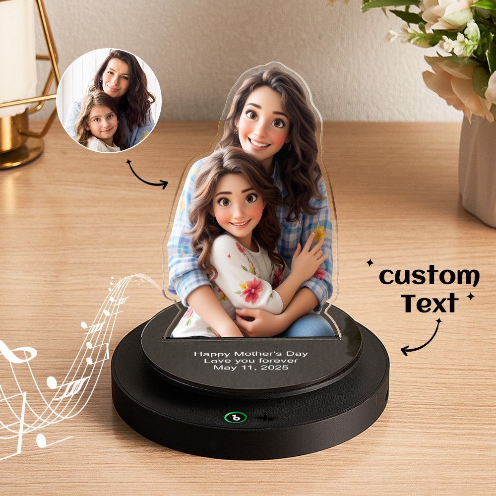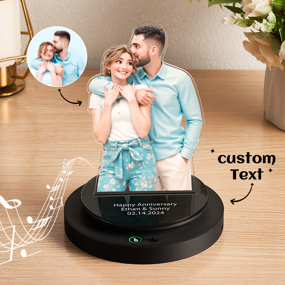 Bewahren Sie Ihre besonderen Momente mit einem Geschenk, das sich bewegt und Melodien spielt! Diese personalisierte Acryltafel dreht sich, um Ihr geliebtes Foto und Ihre eingravierte Nachricht anzuzeigen, während gleichzeitig eine schöne Melodie gespielt wird – Das perfekte Jubiläumsgeschenk für Paare.