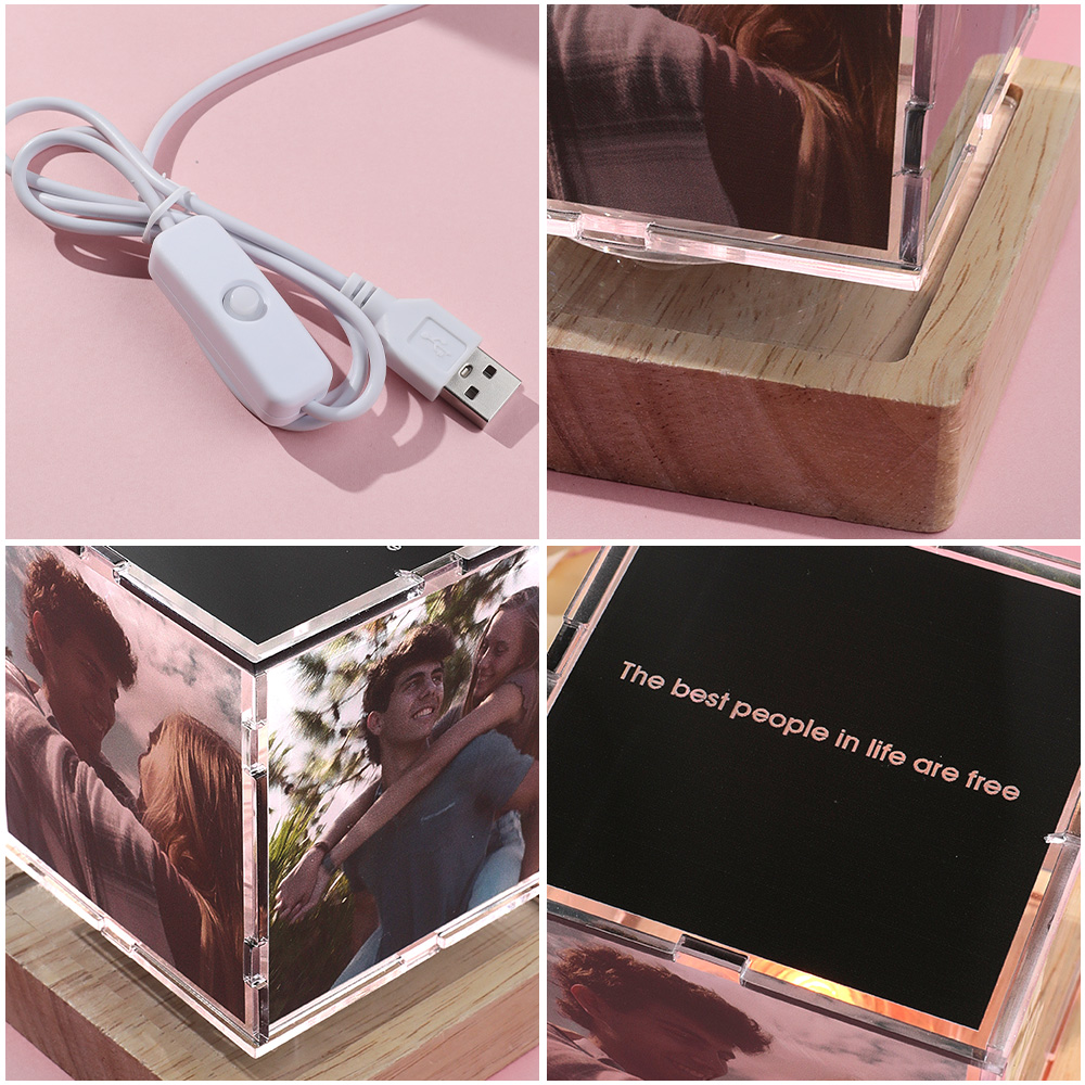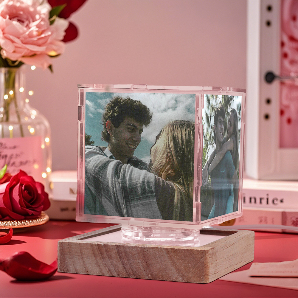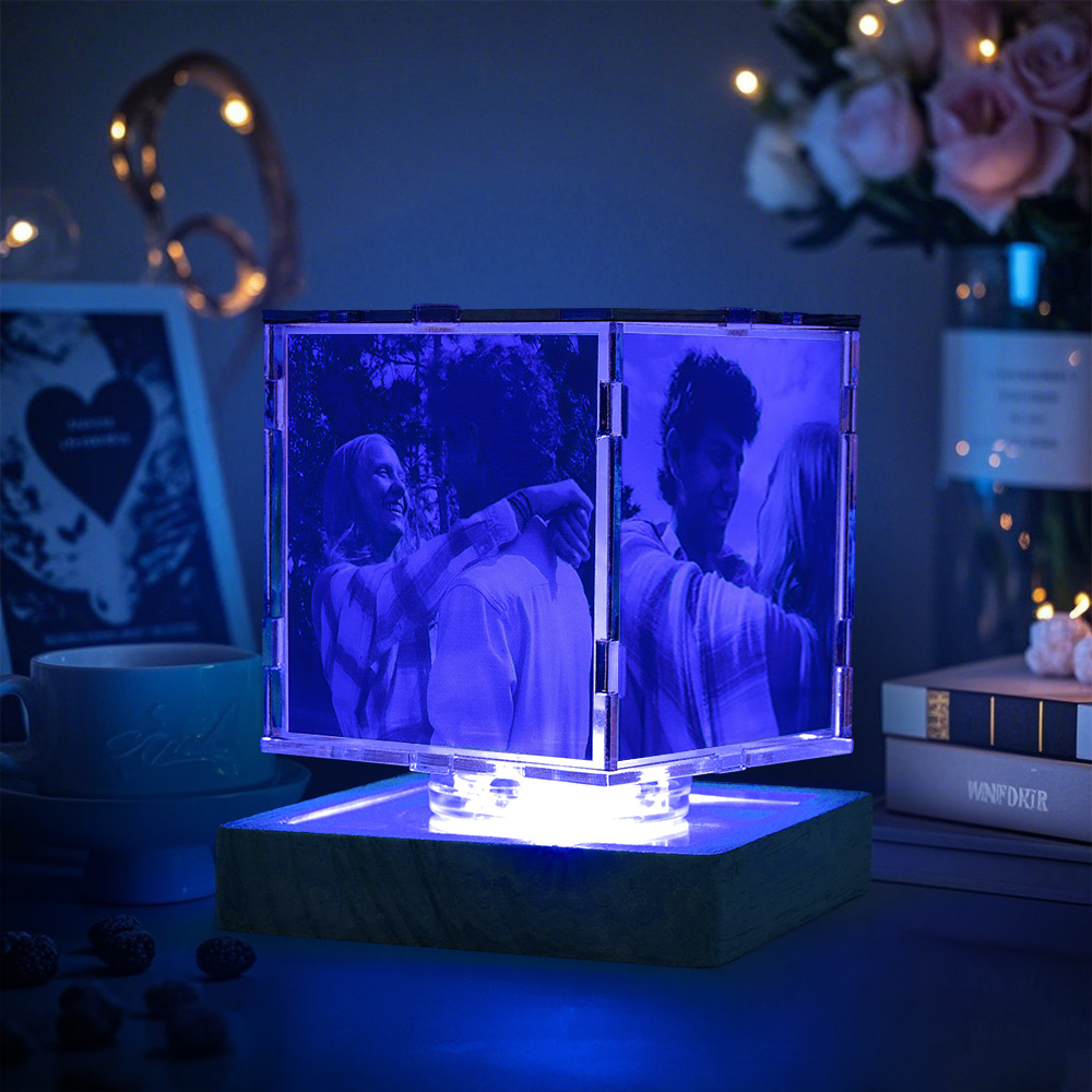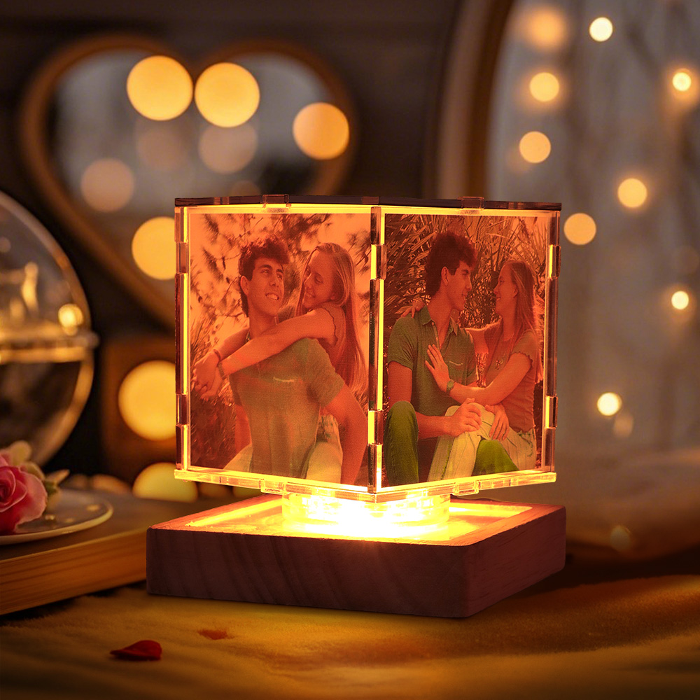 Verwandeln Sie Ihre wertvollen Erinnerungen in ein fesselndes Schauspiel aus Licht und Bewegung! Dieses individuell gestaltete Acryl-Nachtlicht wechselt zwischen sieben bezaubernden Farben und präsentiert Ihre vier persönlichen Fotos und eine optionale Gravur auf einem stilvollen Holzsockel.