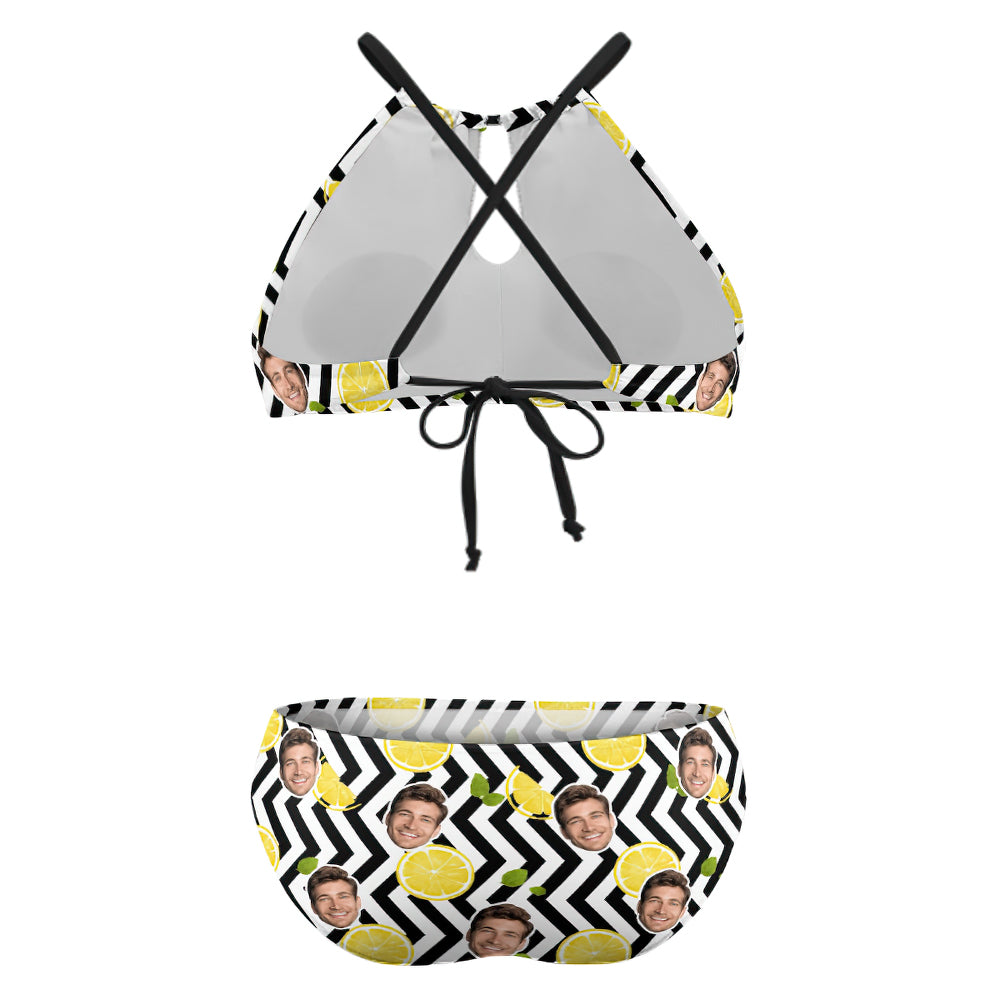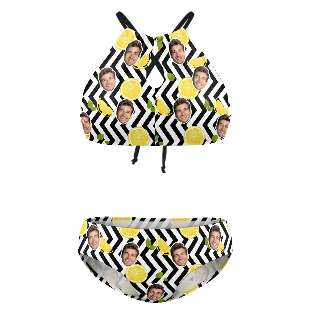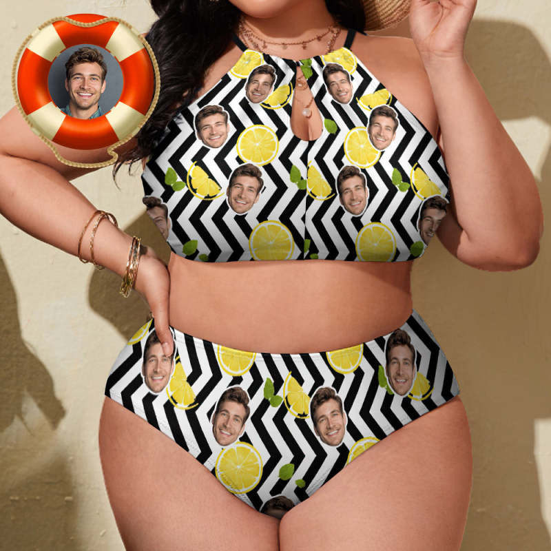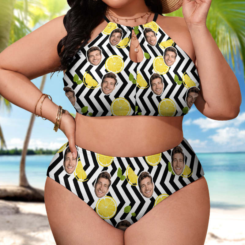 Personalisierter, Hoch Taillierter Bikini-badeanzug Mit Streifen-zitronen-motiv, Individuelles Gesicht, Badebekleidung In Übergröße