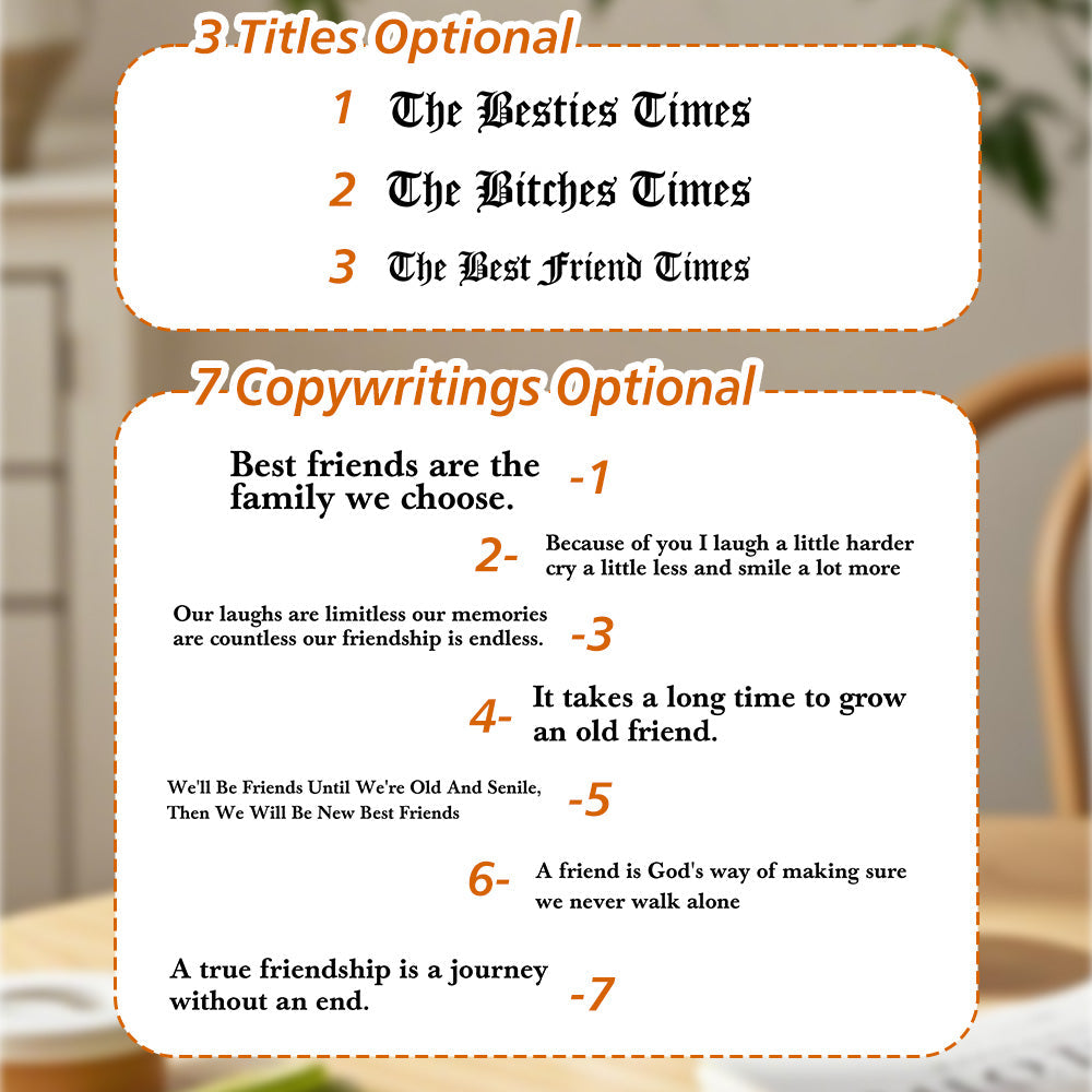 Überraschen Sie Ihre beste Freundin mit einer personalisierten The Besties Times-Tasse! Fügen Sie Ihr Lieblingsfoto hinzu und sorgen Sie mit diesem durchdachten Freundschaftsgeschenk für bleibende Erinnerungen. Diese Fototasse ist eine lustige und einzigartige Möglichkeit, Ihre Wertschätzung zu zeigen. Bestellen Sie jetzt ein einzigartiges Geschenk, das Ihre beste Freundin für immer schätzen wird.