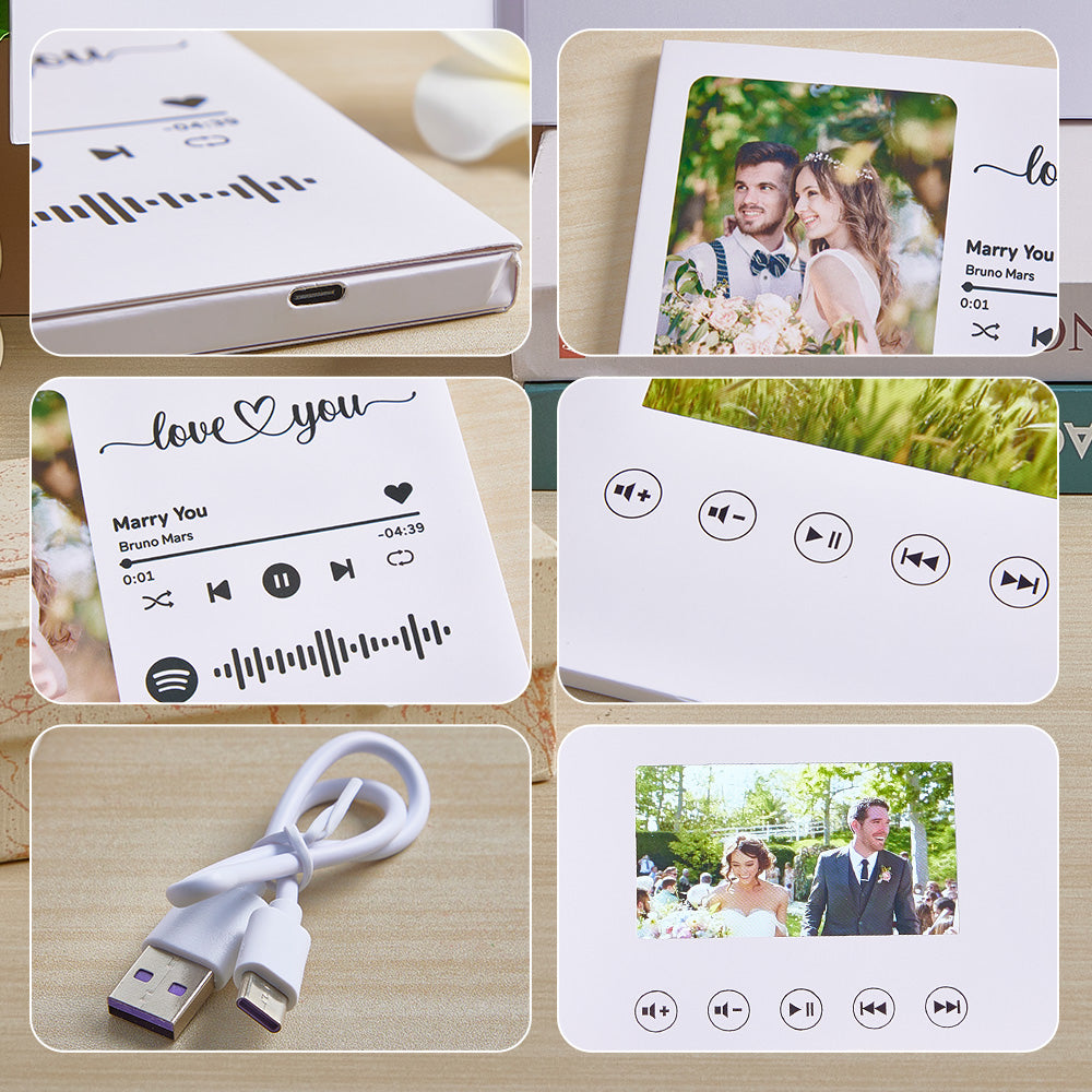 Laden Sie Ihre Videogrußkarte ganz einfach mit dem USB-Kabel auf und stellen Sie sicher, dass sie immer zum Genießen bereit ist. Diese Video-Grußkarte eignet sich ideal als Hochzeitsgeschenk, Geburtstagsgeschenk, Jubiläumsgeschenk oder Weihnachtsüberraschung und ist eine vielseitige und durchdachte Wahl für jeden Anlass.